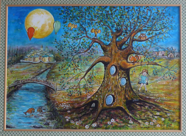L'enfance est ici le sujet principal. On y retrouve également des poissonneaux occupés à pêcher dans la rivière. A l'arrière plan un village... Tout l'univers onirique et féérique de Steva!