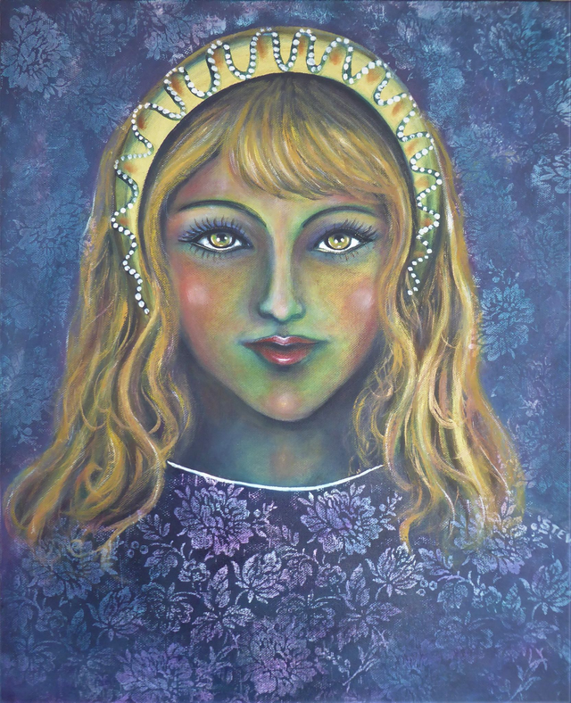 Une Madone d'un style nouveau au regard mystique et perçant qui vous scrute et vous transperce... Acrylique avec effets au pochoir 46x38 cm