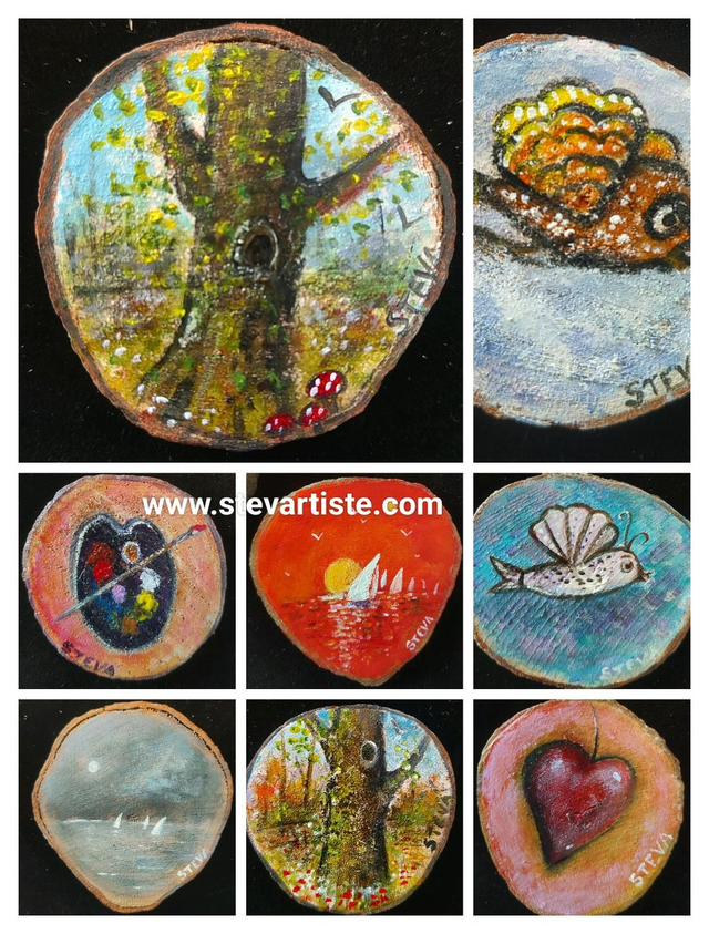Chaque pièce est unique. Peinture acrylique sur rondin de bois. Vendu avec attache